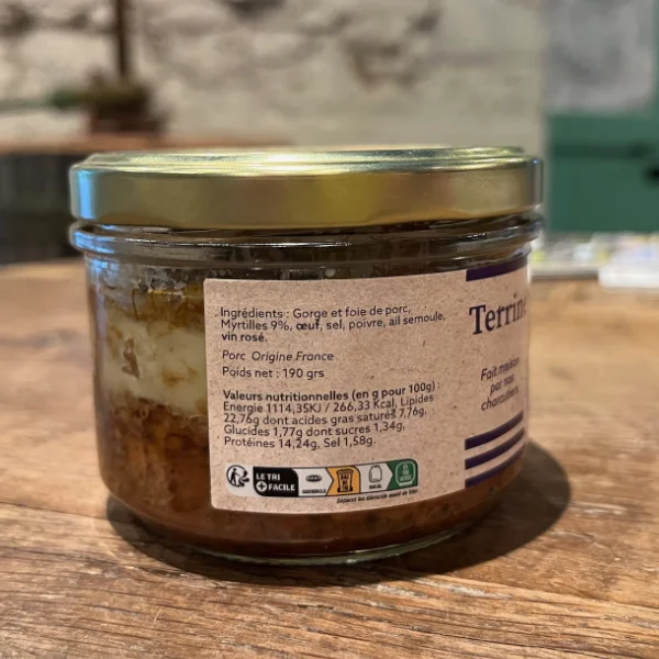 - Ingrédients : Gorge et foie de porc (origine France), myrtilles du Trimoulet (9%), œuf, sel, poivre, ail semoule, vin rosé.
